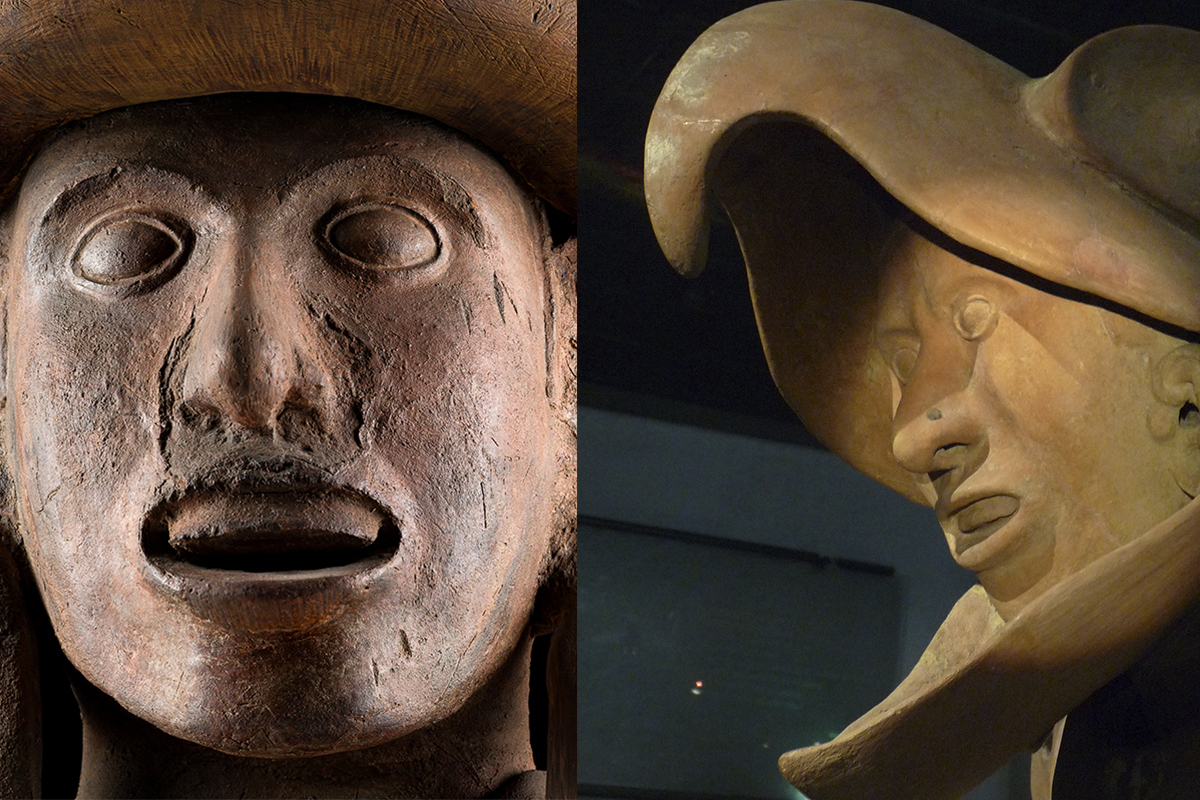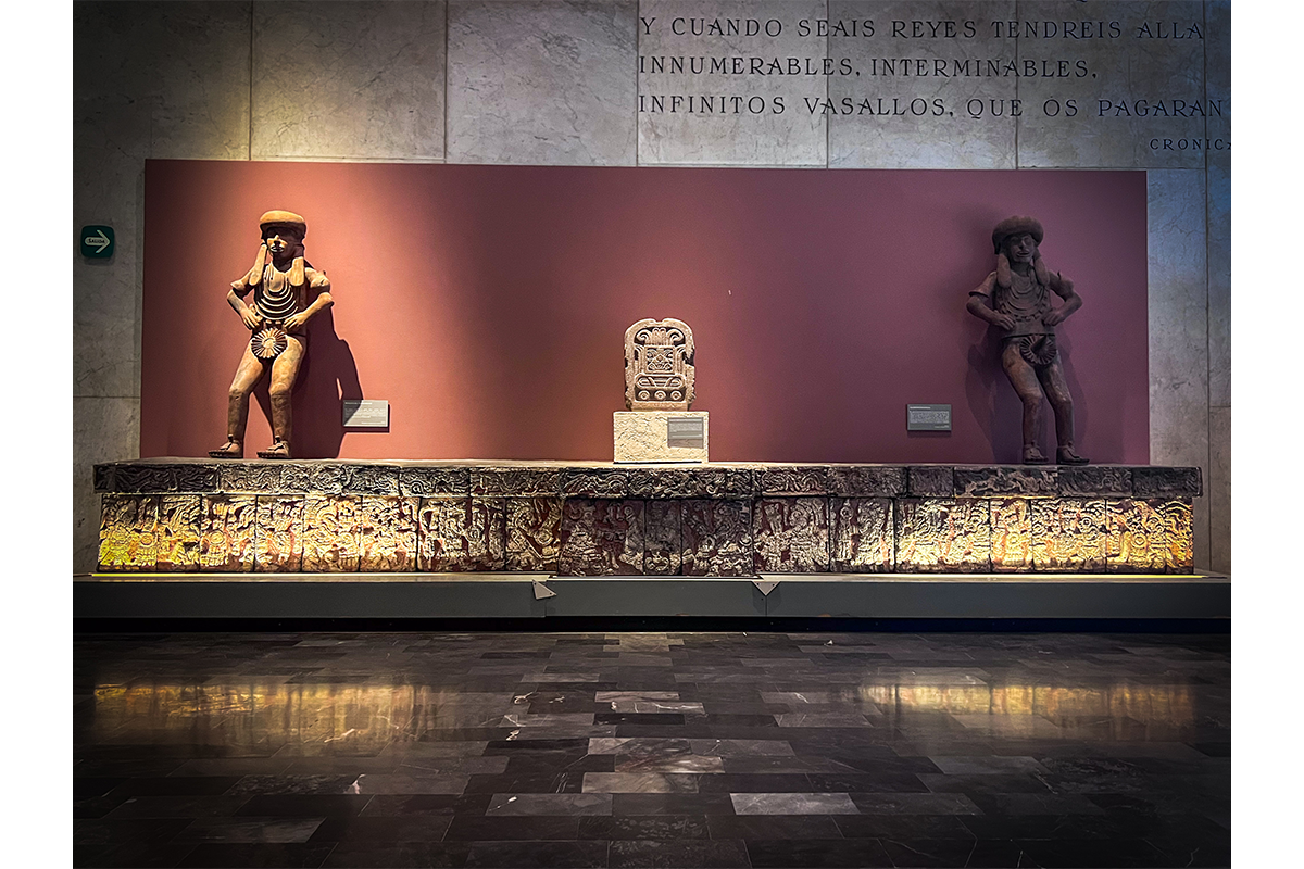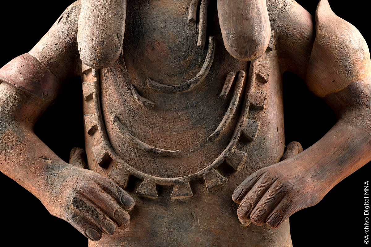 En algunos edificios del recinto sagrado de Tenochtitlan, los mexicas colocaron imponentes figuras de cerámica. Un claro ejemplo de ello lo encontramos en la Casa de las Águilas, en la Zona Arqueológica del Templo Mayor. En su interior se hallaron dos pares de esculturas de cerámica de tamaño natural sobre las banquetas que rodean el recinto, las cuales indicaban la entrada a diferentes ámbitos del edificio. La escultura que aquí se presenta es similar a estas y fue localizada junto a otra igual. Ambas se exhiben sobre una banqueta reconstruida en la sala Mexica del museo.