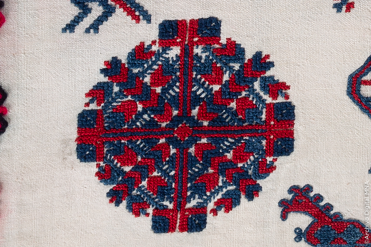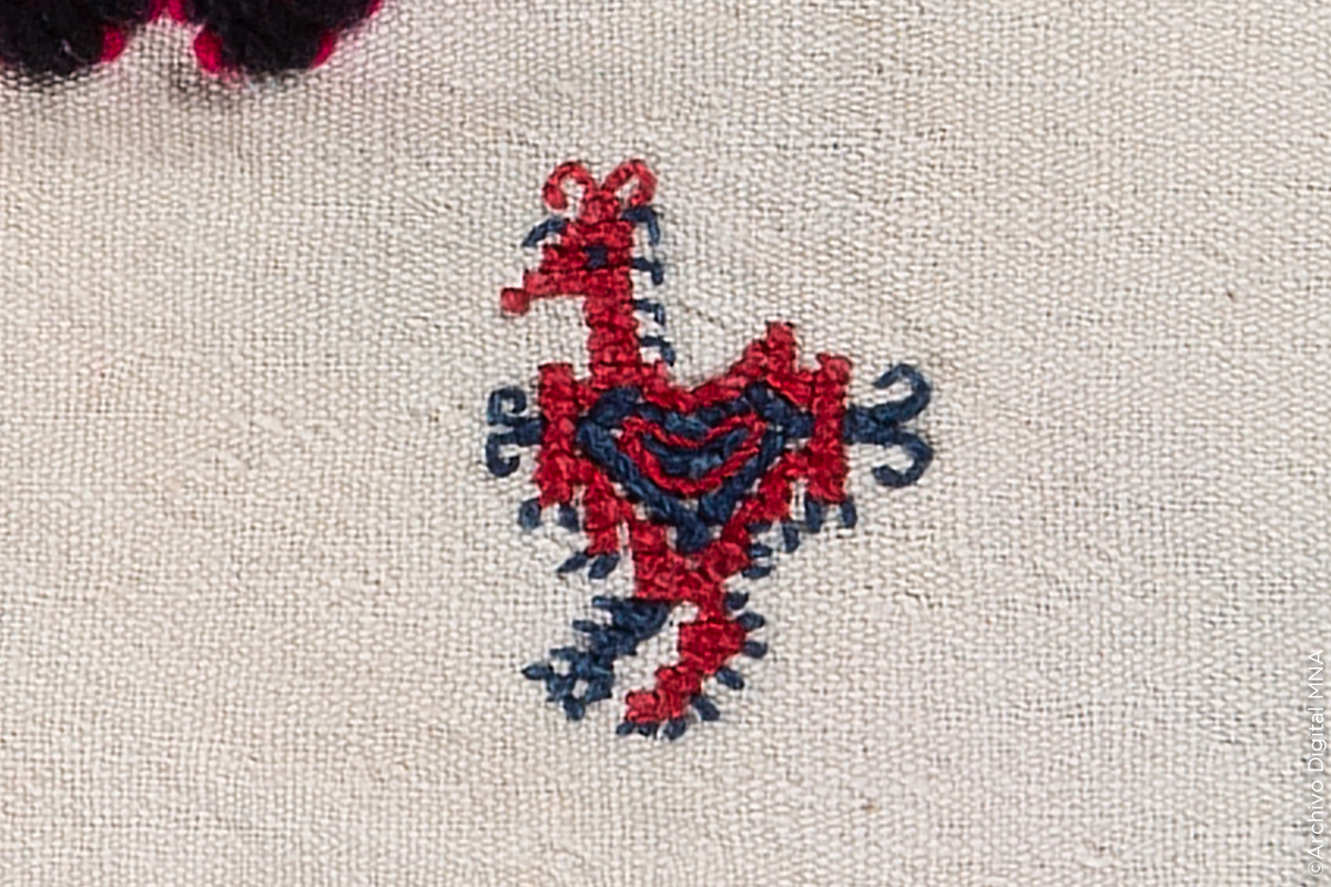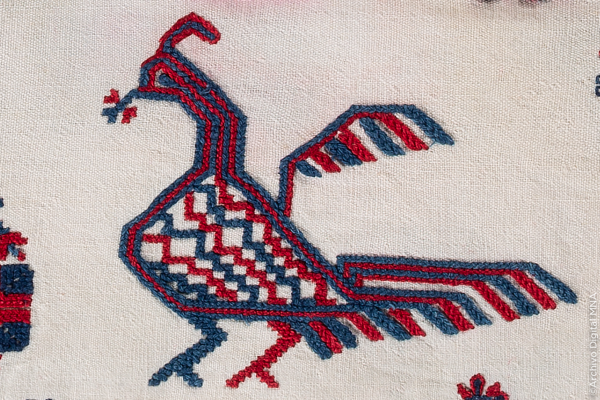 Entre las iconografías destacan árboles de la vida, aves, felinos, caballos y elementos geométricos que se disponen sobre la superficie de fondo blanco, contrastando con tonos de azul oscuro y solferino. Los acabados incluyen randas simples en la unión de los lienzos y festones con puntos de interfaz que adornan los bordes del cuello.