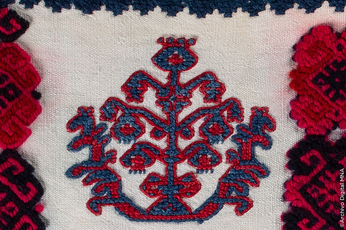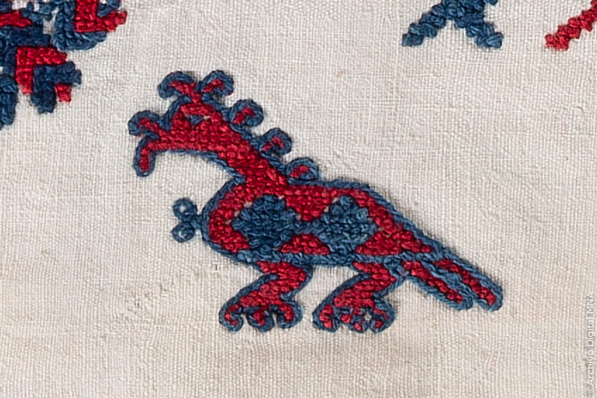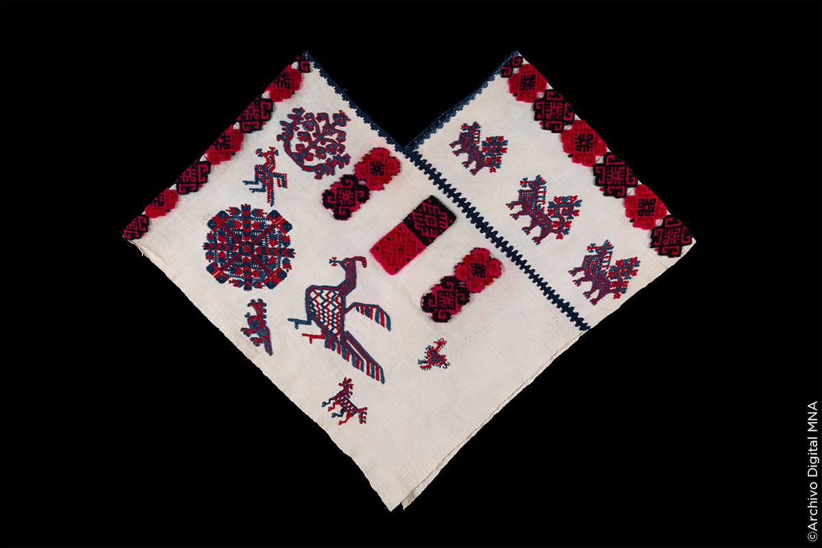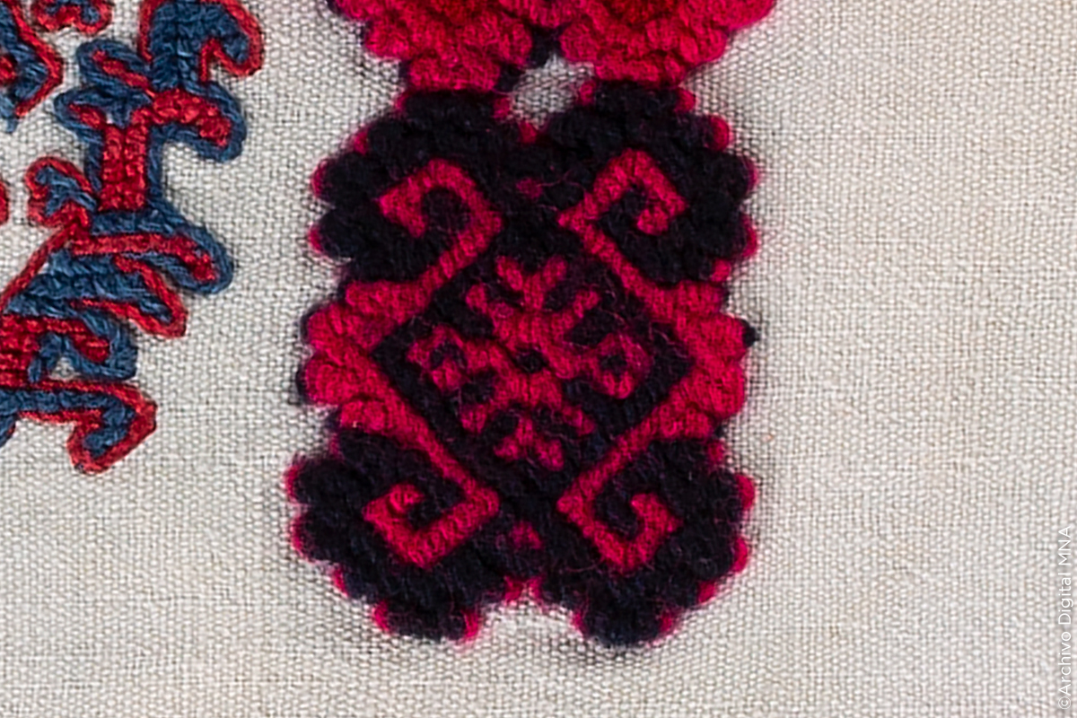 Entre las iconografías destacan árboles de la vida, aves, felinos, caballos y elementos geométricos que se disponen sobre la superficie de fondo blanco, contrastando con tonos de azul oscuro y solferino. Los acabados incluyen randas simples en la unión de los lienzos y festones con puntos de interfaz que adornan los bordes del cuello.