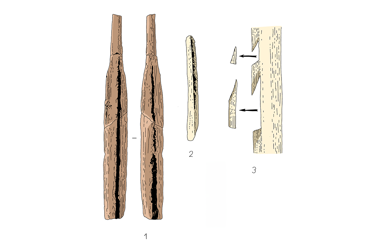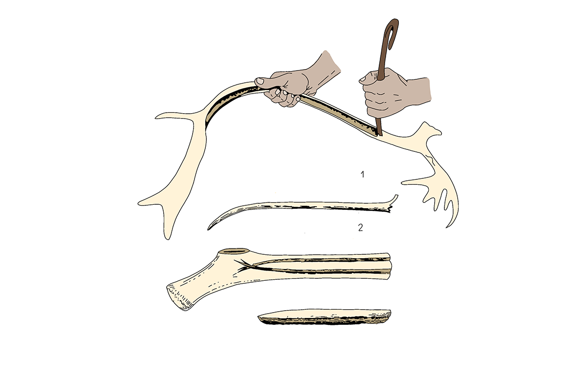 Este tipo de herramienta se fabricaba aserrando y raspando hueso y marfil de diferentes animales. El primer paso era extraer una varilla del cuerpo del hueso a través de un doble ranurado con un buril de piedra; se enderezaba por medio de vapor y un bastón perforado. Posteriormente, se alisaba con una raedera para preparar la confección de los dientes. Esto se hacía practicando una serie de trazos finos oblicuos mediante incisiones con buril; luego, estas se ahuecaban para esculpir los dientes.