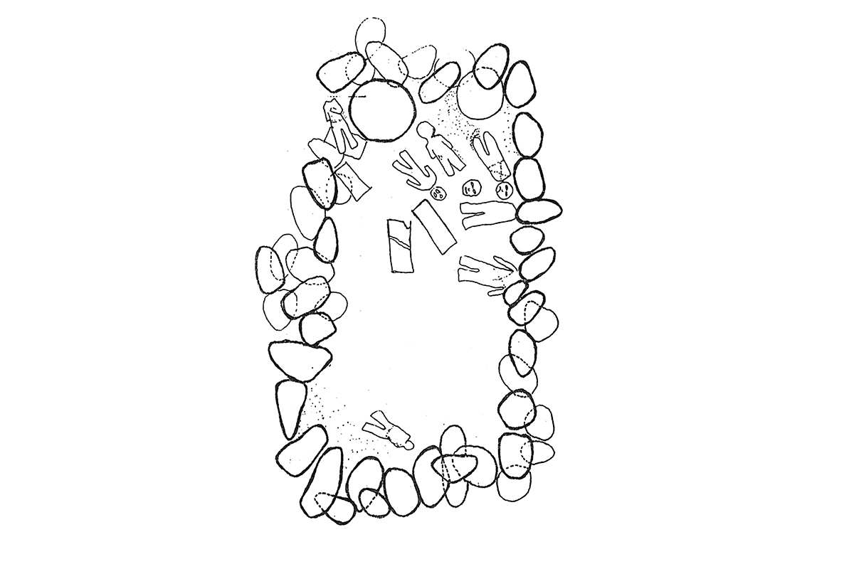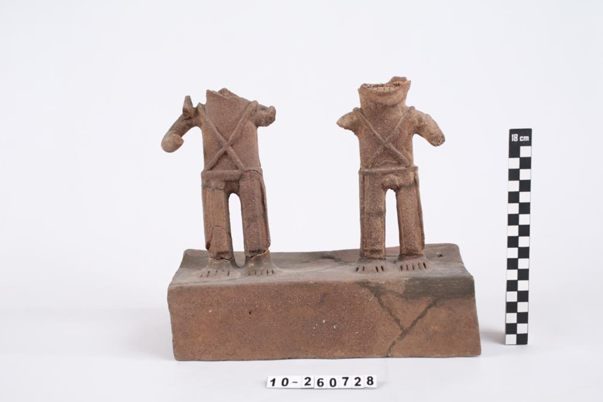 Los personajes representados en esta pieza se encuentran de pie, dispuestos sobre una base hueca rectangular. Llevan una banda en la cabeza que se sujeta con un elemento circular en la parte posterior y una piel en la espalda atada por el frente. En el conjunto de estas esculturas se observa que en sus manos sostienen objetos circulares que pueden interpretarse como escudos, o bien elementos alargados que representan armas, de tal manera, que estos personajes pueden ser interpretados como guerreros. Es importante señalar que estos asentamientos estuvieron en una zona de conflicto por estar situados en la frontera de los imperios tarasco y mexica; si bien en el año 1460, fueron conquistados por el ejército tarasco del cazonci Zizispandaquare.