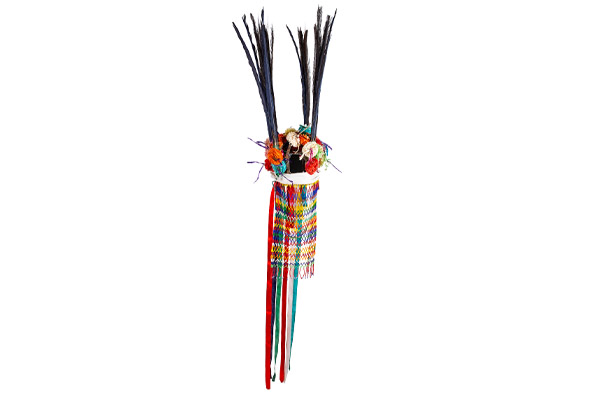 La pieza que se presenta es una réplica de la corona utilizada en la danza de los urraqueros, adquirida en la comunidad náayeri de San Juan Corapan, Nayarit, en 1998. Originalmente formó parte del discurso museográfico de la sala Gran Nayar, pero ahora se exhibe en la nueva sala Fiestas, dentro del módulo que aborda la transformación en el ritual. Es importante destacar que las coronas de los urraqueros náyeri no deben considerarse disfraces; quienes las portan asumen el papel de dioses de la lluvia, y donde quiera que estén, las precipitaciones llegan. Las plumas azules y el velo de chaquira presentes en la corona, representan el agua cayendo.