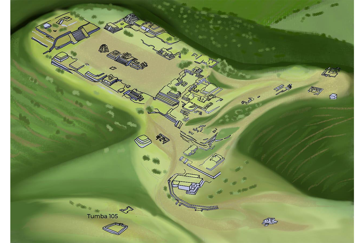 Un ejemplo notable de arquitectura funeraria es la Tumba 105, descubierta por el arqueólogo Alfonso Caso entre 1936-1937, durante la VI temporada de exploraciones del Proyecto Monte Albán, en una de las residencias palaciegas de mayor tamaño de la zona arqueológica, al noreste de la Plaza Principal.