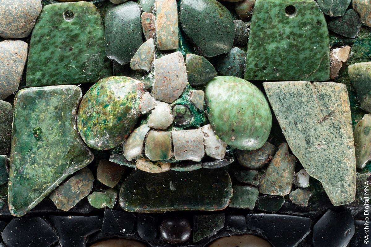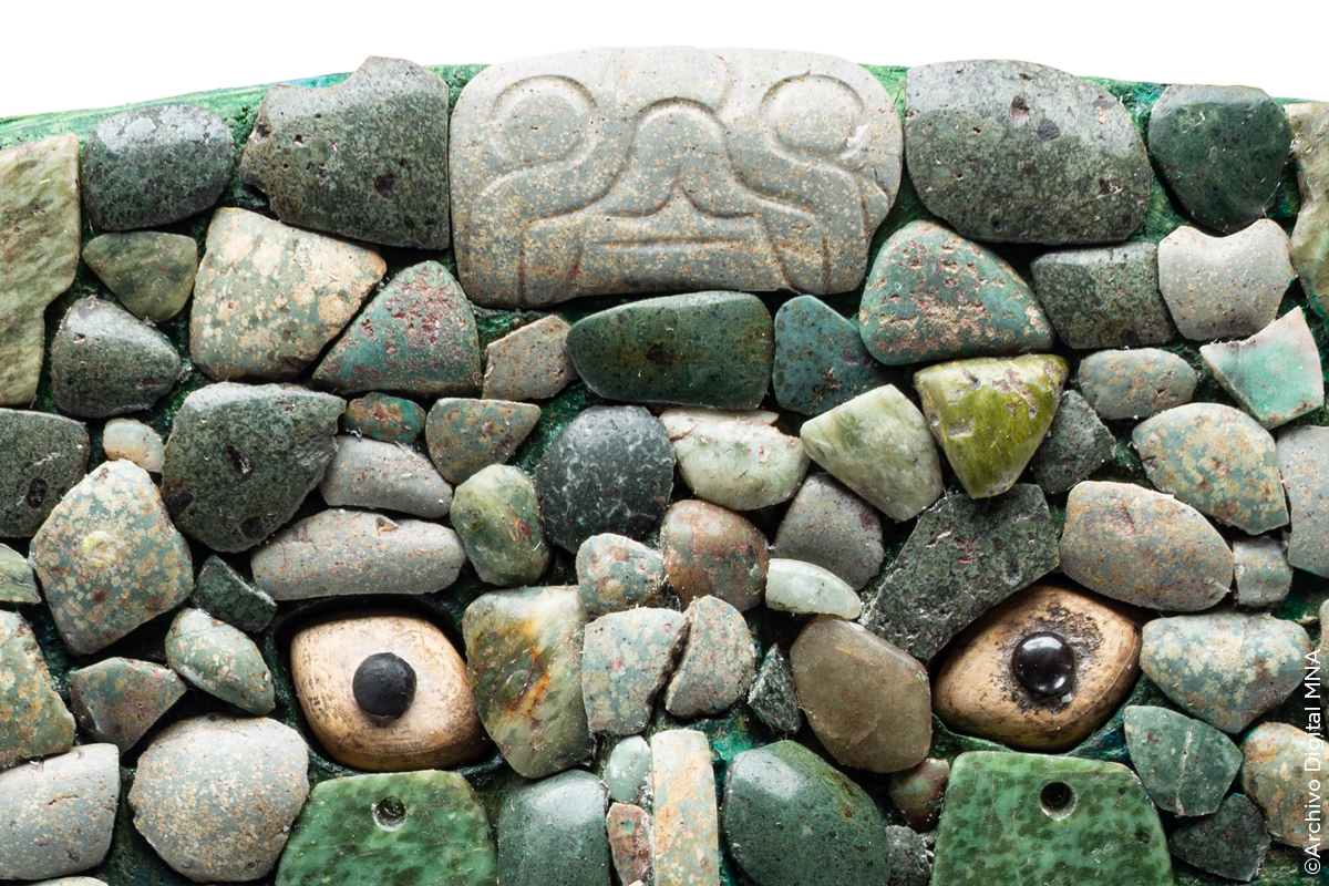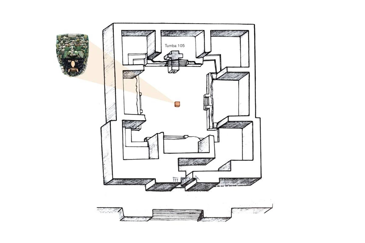Esta pieza se colocó como ofrenda en el pozo de relleno al centro del patio, junto con vasijas llamadas coloquialmente "floreros" y con vasos de forma rectangular. El objeto más importante del ofrecimiento fue la máscara elaborada con piedra verde y negra, así como concha. Arriba de ella, casi al centro, se colocaron 35 cascabeles de cobre.