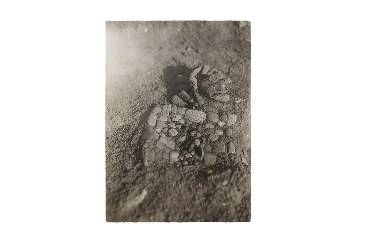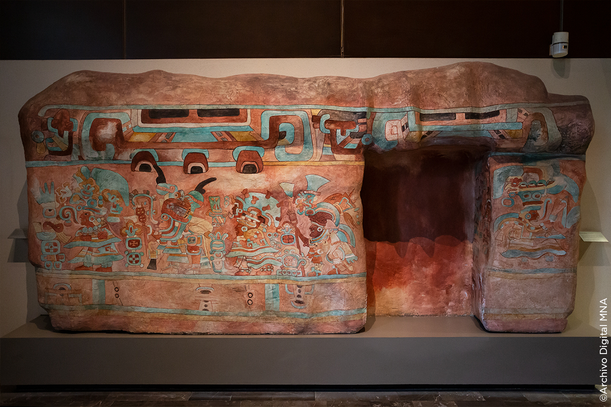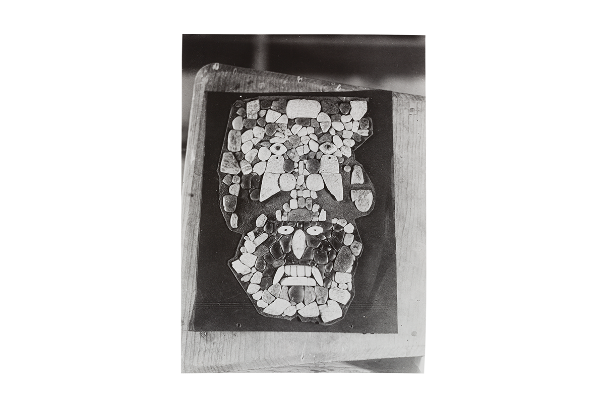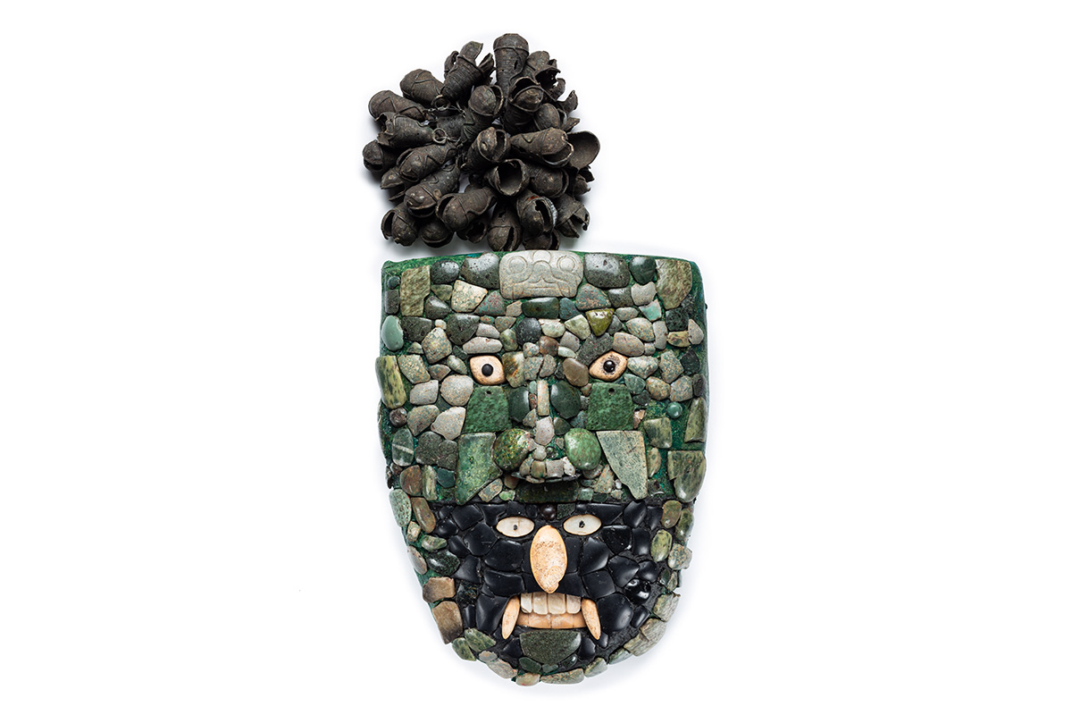 Esta pieza se colocó como ofrenda en el pozo de relleno al centro del patio, junto con vasijas llamadas coloquialmente "floreros" y con vasos de forma rectangular. El objeto más importante del ofrecimiento fue la máscara elaborada con piedra verde y negra, así como concha. Arriba de ella, casi al centro, se colocaron 35 cascabeles de cobre.