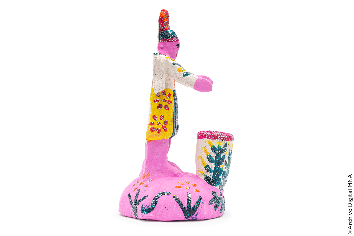 Este objeto es un ángel ritual utilizado como candelero, elaborado por la familia Vidal Juárez, herederos de una larga tradición alfarera que preserva el conocimiento en la creación de figuras de santos. Su proceso de elaboración comienza con la recolección de tierra que luego se limpia y tamiza cuidadosamente hasta obtener una arena fina. Al mismo tiempo, se recolecta la plumilla o flor de tule en zonas próximas a cuerpos de agua, material que se emplea para apelmazar y dar consistencia al barro.