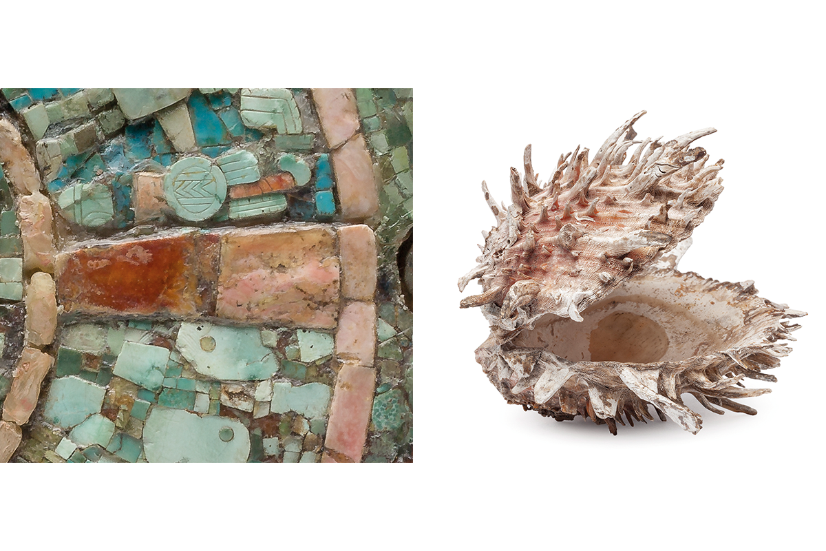 En la cuarta circunferencia vuelve a emplearse el bivalvo, y la pieza concluye con una banda ondulada cubierta con piedras verdes, reforzando su carácter simbólico y ritual dentro del contexto funerario mixteco.