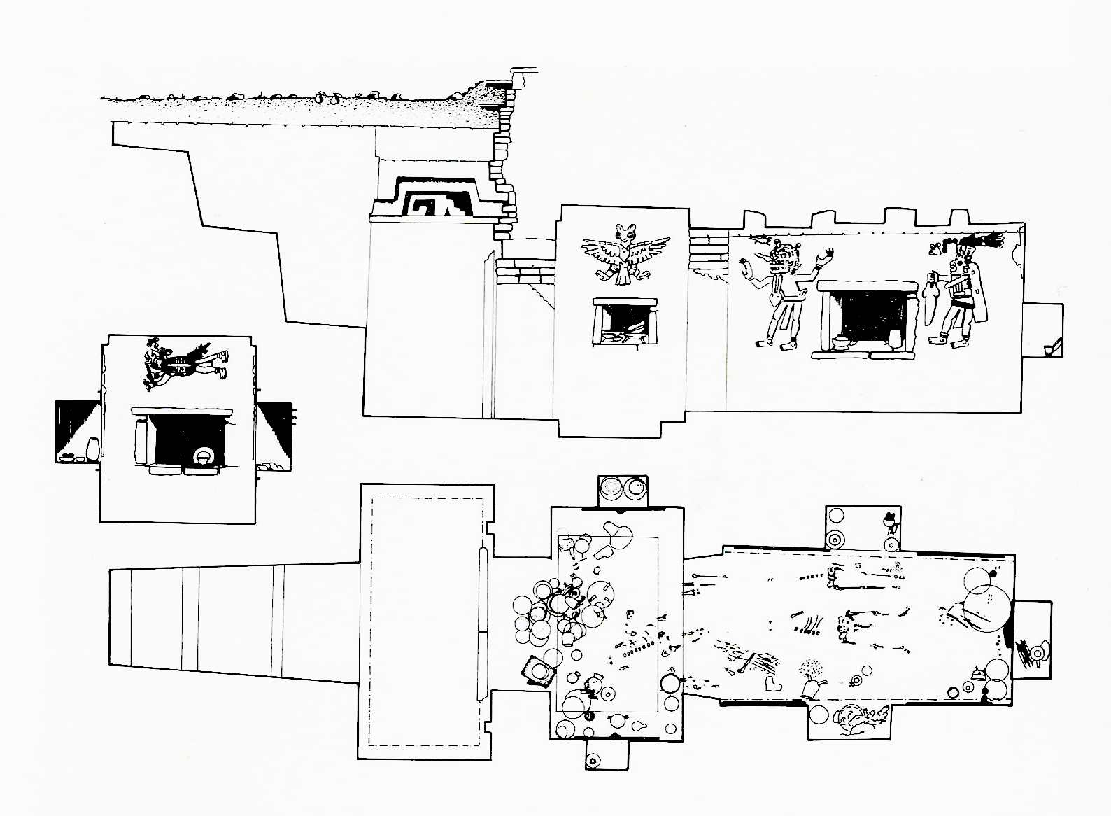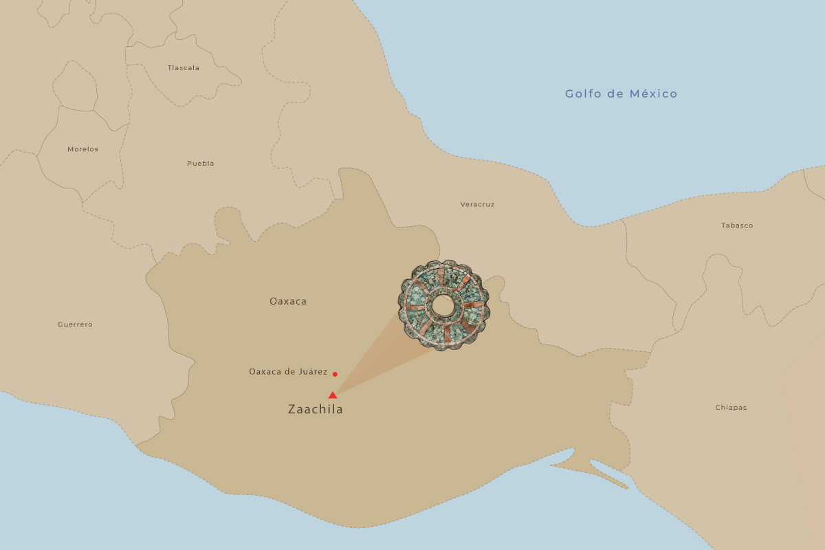 Las ofrendas depositadas en las tumbas 1 y 2 en la antigua ciudad de Zaachila, también conocida como Teozapotlán, fueron exploradas en 1962 por el arqueólogo Roberto Gallegos. En estos sepulcros mixtecos se han recuperado suntuosas ofrendas, entre las que destaca la tumba 1, donde se localizaron cuentas y tres discos elaborados con piedras de tonalidades azules —consideradas turquesas—, así como diversas piedras verdes. De estos discos de mosaico, sólo uno pudo ser reconstituido; es la pieza que aquí se presenta y que sobresale por su carácter excepcional.